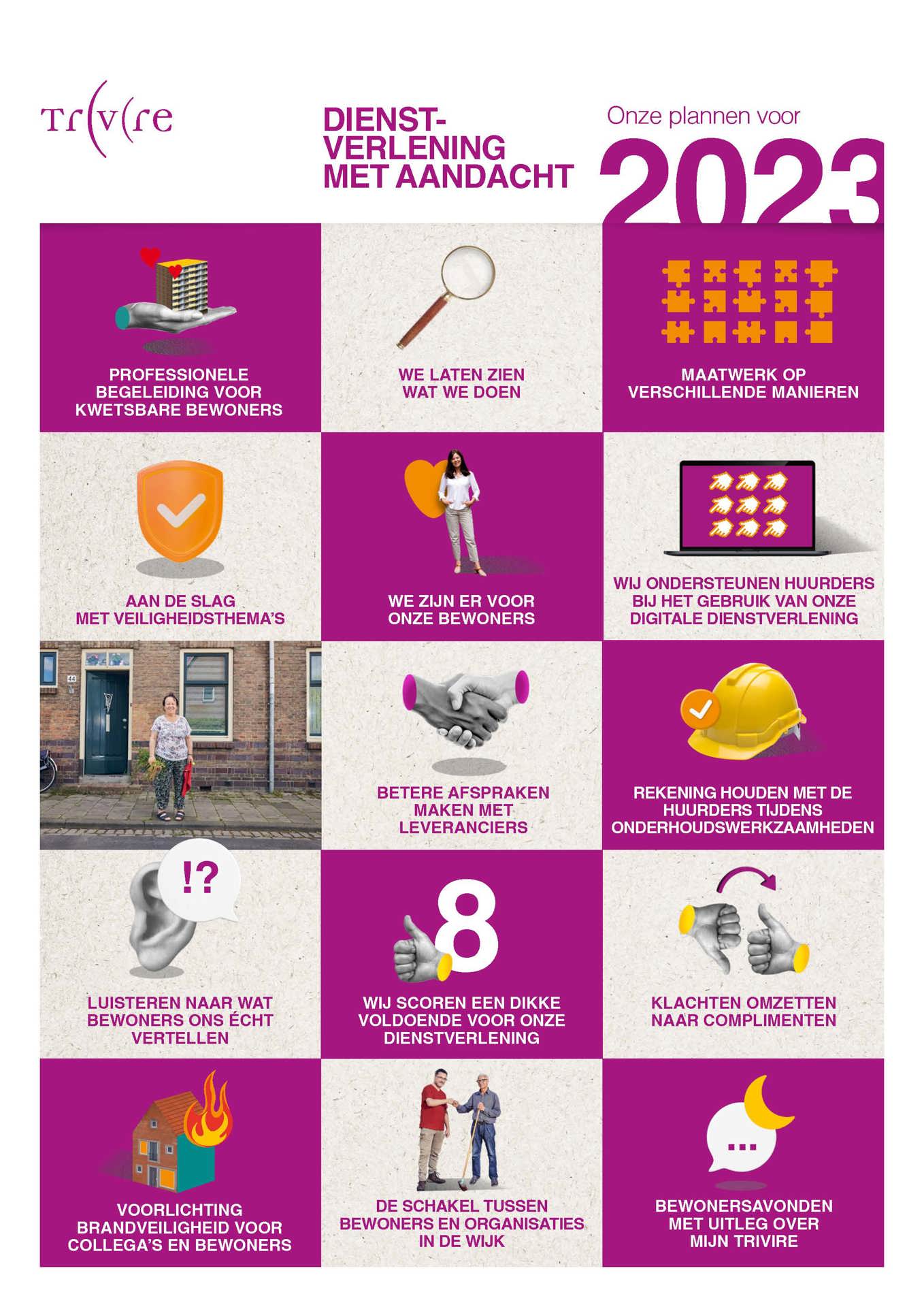 Waarom? 2022 was voor Trivire een bijzonder jaar. In het weekend van 27 maart 2022 vond namelijk een cyberaanval plaats, die via onze ICT-dienstverlener ook Trivire raakte. Deze aanval heeft grote impact op ons gehad en daarmee deels ook op onze dienstverlening. En nog steeds ondervinden wij dagelijks de gevolgen van de aanval op onze systemen. We zijn trots op het begrip bij onze huurders en de creativiteit en flexibiliteit van onze medewerkers. Maar tegelijkertijd was - en is het soms nog - een moeilijke tijd die veel vraagt van onze organisatie. En daarom hebben wij besloten om voor het jaarplan 2023 niet één maar twee jaar de tijd te nemen.