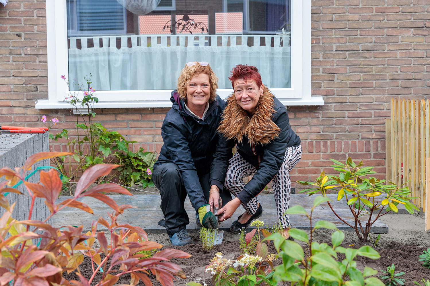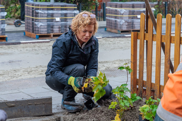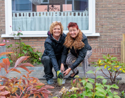 Omdat de gemeente Zwijndrecht en Trivire samen optrekken in deze vergroening, mochten wethouder Jacqueline van Dongen en onze bestuurder Tinka van Rood als eerste hun handen vies maken. Samen zetten zij de eerste planten in de grond in de tuinen van bewoners. Dit deden zij in de stromende regen onder de vakkundige begeleiding van hovenier A-garden. Over twee jaar moeten de planten goed zijn aangegroeid.