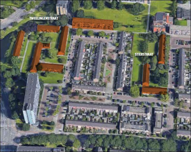 De verduurzaming van het wooncomplex aan de Tweeling-Stierstraat te Dordrecht staat in de steigers. Letterlijk. De 128 woningen worden gerenoveerd en voorzien van isolatie, duurzame verwarming en nieuwe keukens en badkamers. Inmiddels wonen nog ongeveer 20 huishoudens al langere tijd in deze buurt, de overige ca 100 woningen zijn de afgelopen jaren leeggekomen. Het wooncomplex ligt in een groene buurt waar het prettig wonen is en waar de komende maanden circa 100 nieuwe huishoudens komen wonen.