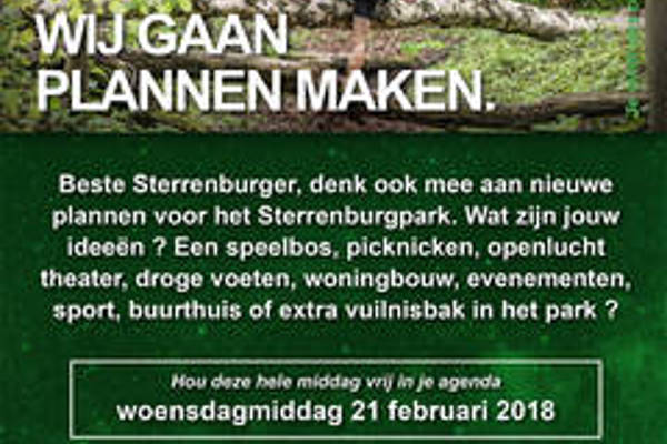 Op woensdag 21 februari 2018 organiseren onder andere gemeente Dordrecht, divers bedrijven en instellingen en bewoners van Sterrenburg een middag om over elkaar te denken over het Sterrenburgpark. Iedereen is welkom!