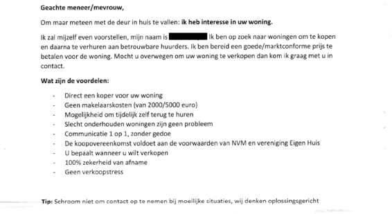 De laatste tijd ontvangen we veel meldingen van huurders dat ze brieven in de bus krijgen waarin partijen aanbieden om hun woning te kopen. Deze brieven zitten soms ook in een envelop met een Trivire logo erop. Dit zorgt bij sommige huurders voor de nodige verwarring en onrust. Dit zijn geen officiƫle brieven van Trivire. Daarnaast is het ook een vorm van woonfraude. Wij raden u dan ook aan hier niks mee te doen.