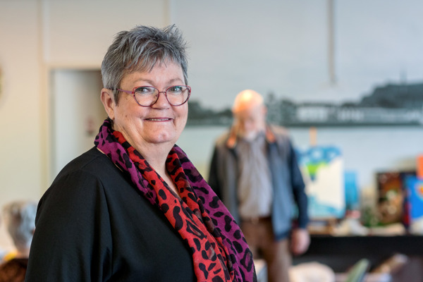 “Veel deelnemers die hier komen zeggen ‘Ik ben niet creatief’. Dat dacht ik van mijzelf ook. Maar inmiddels noem ik mijzelf toch een kunstenaar. Onze deelnemers laten we volgens de zelf ontwikkelde ‘blauwe koe methodiek’ kennis maken met creativiteit. En als je iets heel kleins aan het maken bent of je bent met verf aan het smijten op een doek, dan gebeurt er echt wat anders met je. Maar heel veel mensen zijn bang om nieuwe dingen te doen, omdat ze denken dat ze het niet kunnen. Een mooi voorbeeld is een mevrouw die hier kwam en die zei; ‘ik kan niets’. We leerden haar in fases schilderen, waardoor ze nu veel meer zelfvertrouwen heeft. Maar iedereen hier heeft een verhaal en we kennen dat verhaal. Dat is zo belangrijk. Want we leven in een maatschappij waar alles snel moet en alles moet perfect zijn. Maar wanneer is iets perfect en waarom moet dat? Ook dat soort gesprekken voeren we met elkaar. We nemen de tijd voor elkaar én hebben echte aandacht. Dat is tegenwoordig al niet meer vanzelfsprekend. Ik wil ook dat mensen hier een beleving krijgen. Dus we hebben altijd lekkere koffie, chocolademelk en koekjes”.