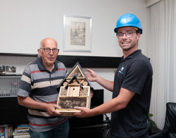 Inmiddels is de 100e woning verbeterd en dit konden we niet stilletjes voorbij laten gaan. Samen met Zwaluwe Bouw hebben we de bewoners van de 100e woning verrast met een insecten hotel. Het cadeau werd goed ontvangen. Deze bewoners nemen actief deel aan de klankbordgroep waardoor ze, ook namens de andere bewoners in de wijk, hebben meegedacht met het plan en de uitvoering. Ze zijn erg blij met hun verbeterde woning!
