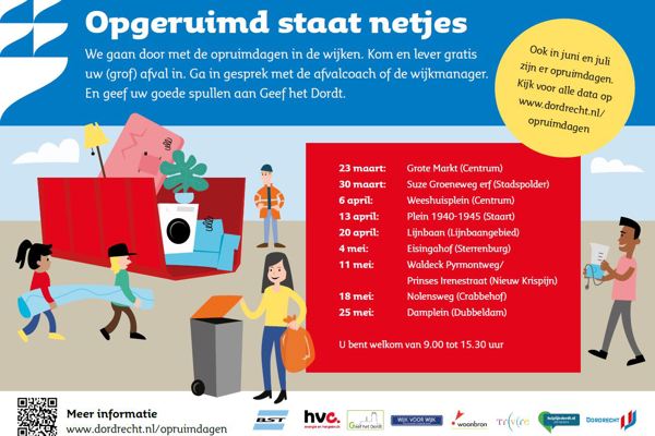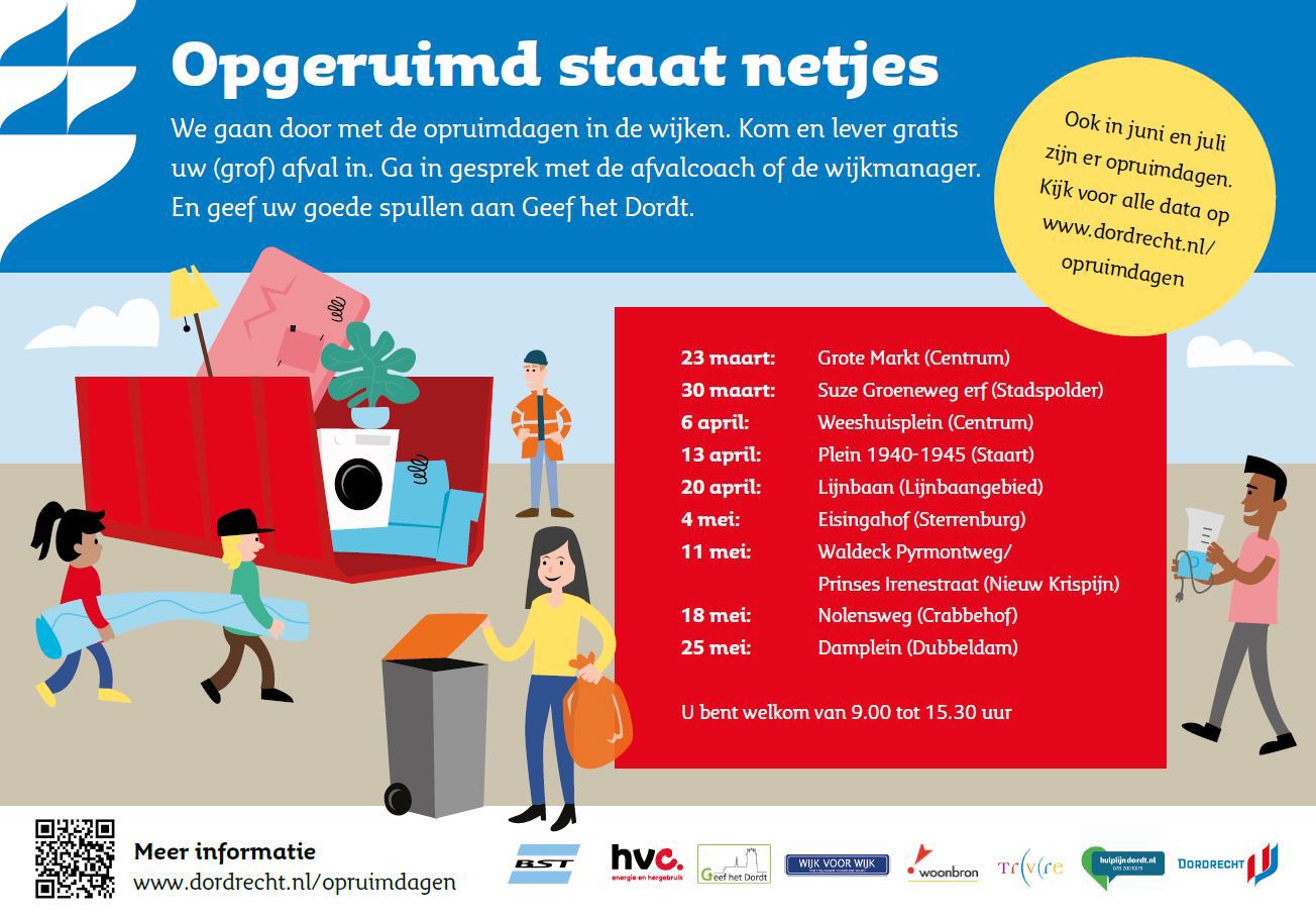 Wie vragen heeft, kan die stellen aan de afvalcoaches. 'Geef het Dordt' pakt spullen aan die nog goed zijn. Ook zijn de wijkmanagers op bepaalde tijden aanwezig.