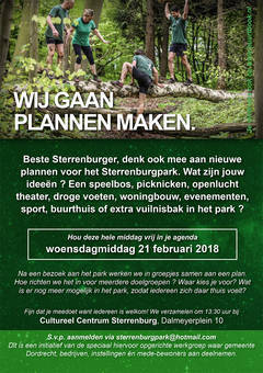 Op woensdag 21 februari 2018 organiseren onder andere gemeente Dordrecht, divers bedrijven en instellingen en bewoners van Sterrenburg een middag om over elkaar te denken over het Sterrenburgpark. Iedereen is welkom!